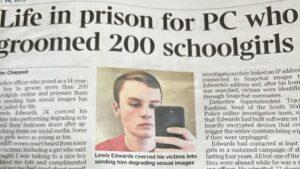 Once he had what he wanted, he blackmailed girls between the ages of 10-years-old and 16-years-old into sending more extreme sexual images of themselves over Snapchat, which he recorded and saved on a number of devices. The headline in the South Wales Echo (SWE) was that Edwards was “‘SADISTIC'”, and in The Times it was: “Life in prison for PC who groomed 200 schoolgirls”.