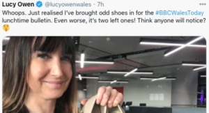 In the past, Mrs Owen has called a ‘crisis’, as well, wearing odd shoes into the office to broadcast the lunchtime bulletin, and asked whether anyone would notice. She even included for us a shocked face emoji after that comment, and following it Mrs Owen published on Twitter: “Crisis over!”.