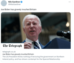 But Nile Gardiner (a former aide to Margaret Thatcher, and contributor to The Telegraph) said: “Joe Biden has gravely insulted Britain”.