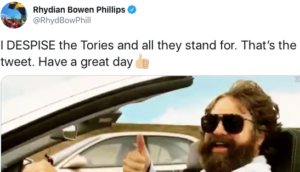After his uncompromising stance was trailed with a speech in Cardiff BBC Cymru Wales (BBC CW) presenter Rhydian Bowen Phillips declared on Twitter that he despises Tories, stressed that Wales should stand up to Westminster, and in one public message just said six times “Wales is a different country to England”. Even before the speech – and with controversy growing over the ‘bias’ of the BBC – Mr Phillips had made his views known. He tweeted a picture of himself flashing the ‘V’ sign at a poster of Margaret Thatcher. He hosts a BBC Radio Cymru (BBC RC) programme on Saturdays from 11am – 2 pm with the actress Shelley Rees and he has long made his opinions public, seemingly putting himself at risk of the new DG’s strict policy.