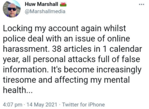 Mr Marshall has complained on social media, of the number of times The Eye are ‘targeting’ him, that Mr Parry is a (wrongly spelt) “harraser (sic)” when it is actually Mr Marshall who has harassed people, he has claimed the police became involved when they have not, and that it is affecting his mental health, while Mr Parry is extremely knowledgeable about this issue and the importance of it being avoided.