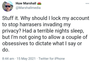 In response to the demand that we should be closed down, the reply was made that: Huw Marshall has: 1. Been investigated by the police for harassment. 2. Made sick ‘jokes’ on Facebook about the murdering gunman Raoul Moat. 3. Called senior politicians Ken Skates and Peter Black ‘twats’ online. 4. Been reprimanded by Twitter. 5. Sent unwanted takeaways to people’s houses”.