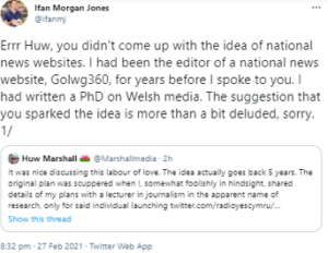Mr Marshall declared: “I somewhat foolishly in hindsight shared details of my plans with a lecturer in journalism in the apparent name of research, only for said individual launching twitter.com/radioyesymru/..”. But Dr Jones hit back with: “The suggestion that you sparked the idea is more than a bit deluded. sorry. 1/”.