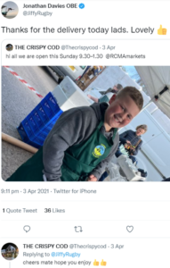 Earlier THIS year, Mr Davies thanked them for the delivery saying it was lovely, with a thumbs up sign, and included a social media announcement giving the business’s opening times. In the past he has even made a video featuring the Crispy Cod.