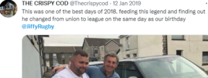 Despite this The Crispy Cod said: “This was one of the best days of 2018. feeding this legend and finding out he changed from union to league on the same day as our birthday @JiffyRugby” with a picture of Mr Davies embracing Mr Williams.