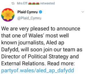 But one leading political commentator in Wales told The Eye at the time: “This is further evidence that the journey from BBC Wales to Plaid Cymru is a short one”.