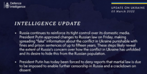 A UK Ministry of Defence update has noted that Russia continues to reinforce its tight control over domestic media.
