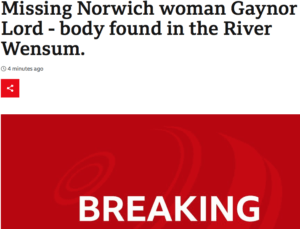 A few hours later we also had from the giant corporation as ‘BREAKING NEWS– “LIVE ‘High probability’ Gaynor Lord went into Norwich river – police”. Sadly it was also ‘BREAKING NEWS‘ that a body was later found.
