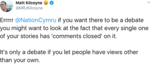 The tweet from Matt Kilcoyne was labelled for the nationalist website Nation.Cymru (NC), and included a link to an ‘opinion’ piece it published on Sunday which proclaimed:  “Welsh Labour needs to stop denying and start embracing the debate over Welsh independence”.