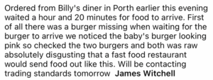 Plainly customers are unhappy at the service they have received with Billy’s Diner.