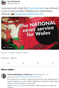 She tweeted, too, a message of support to former Plaid Cymru (PC) leader Leanne Wood who lost her Rhondda seat in May’s elections (which saw an incredible fall out), and was condemned as well by WAAS.