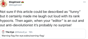 But to be charitable, perhaps journalists in the mainstream media are not prepared to endure the kind of abuse I suffer online. I have been called on Twitter (incorrectly) a “lying bastard” a “misogynist”, a “git” and one critic said “I’ll whack him (me)“. The latest insult after a story The Eye published last night is to label me (again wrongly) an “anti-devolutionist”.
