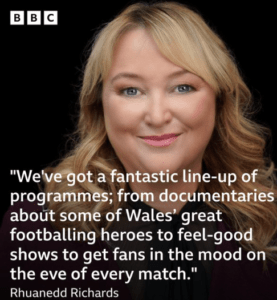 BBC Cymru Wales (BBC CW) has joined in. The controversial former Plaid Cymru (PC) Chief Executive now BBC CW Director, Rhuanedd Richards, is clearly excited about what the broadcaster will offer its audience, proclaiming: “We’ve got a fantastic line-up of programmes; from documentaries about some of Wales’ great footballing heroes to feel-good shows to get fans in the mood of every match”.