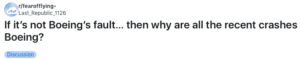 “But then I ask myself… why do these things keep happening to Boeing planes? • The MAX disasters were supposed to be a one-off design flaw that’s now fixed. • Then we had doors blowing off mid-flight (thankfully no one hurt). • Now another crash, again involving a Boeing jet.”