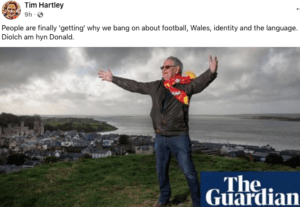 In one Facebook (FB) post a day before the tournament kicked off, and including a link to a UK newspaper piece with Daffydd Iwan’s ‘Yma o Hid’, he said: “People are finally ‘getting’ why we bang on about football, Wales, identity and the language. Diolch am hyn Donald. He posted, too, pictures on his FB page from inside the stadium before or during the Wales game against USA.