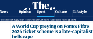The way tickets are being sold for the event has been condemned, with one UK paper describing it in this way: “Dynamic pricing, crypto detritus and corporate doublespeak have made the task of buying 2026 World Cup tickets a grim case study in the monetization of emotion”.