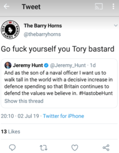 The ‘Tory bastard’ comment was hurled by The Barry Horns on Twitter at the then UK Health Secretary Jeremy Hunt.