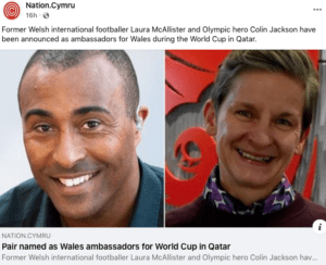 Ex-sprinter and Olympic silver medallist, Colin Jackson, who came out as gay in 2017, will be joined by former Welsh footballer, Laura McAllister, a one-time board member of the gay activism charity, Stonewall, which proclaims on its website masthead: “Stand with LGBTQ+ people in Qatar”.