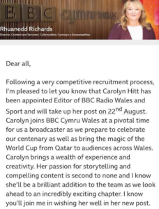The former PC Chief Executive Ms Richards (who announced Ms Hitt’s appointment) was made Editor of BBC Radio Cymru herself (before Ms Hitt), as well as the Welsh language online service, Cymru Fyw, and went on to be given a very senior role at the corporation.