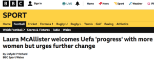 In the latest incident last week the BBC Sport Wales ‘report’ began: “Laura McAllister has welcomed Uefa’s decision to have at least two women on its executive committee (ExCo) – but warns further change is needed…”.