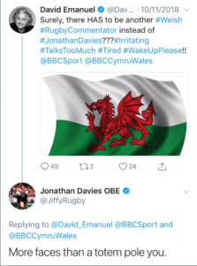 Four years after the fire extinguisher stunt, the famous fashion designer David Emanuel announced on Twitter:  “Surely, there HAS to be another Welsh RugbyCommentator instead of Jonathan Davies??? Irritating.  TalksTooMuch. Tired. WakeUpPlease!!@BBCSport @BBCCymruWales”.