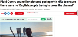 The Guardian reported that: “Police are investigating a social media post from a Plaid Cymru councillor apparently posing with a rifle near a Welsh beach and commenting that he was checking “there wasn’t any English people trying to cross.
