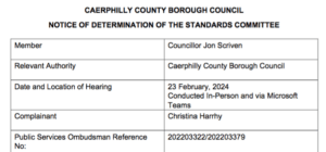 In a “NOTICE OF DETERMINATION OF THE STANDARDS COMMITTEE” by “CAERPHILLY COUNTY BOROUGH COUNCIL” officials took action, more than a year and a half after a controversy broke
