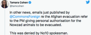 But new emails released by the Foreign Affairs Select Committee (highlighted by Sky’s Political Correspondent Tamara Cohen), which is conducting an inquiry into the UK Government’s handling of the Afghanistan crisis, suggest Mr Johnson DID personally authorise rescue efforts for pets and animals.