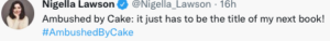 Even the celebrity TV chef Nigella Lawson got in on the act by tweeting about the incident, ironically: “Ambushed by Cake: it just has to be the title of my next book (Hashtag) AmbushedByCake”.