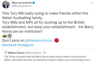 As the FAW have been notified, TBH briefly faced being barred from Twitter following their offensive comments, and after the ban was lifted said that they were “beautiful”, yet queries were raised about this contentious decision. The former leader of Plaid Cymru (PC) Leanne Wood spoke out against the restriction at the time, saying on Twitter: “…you ban the Barry Horns? For defending the NHS?”, this was then re-tweeted by the disgraced one-time PC (then independent) MP Jonathan Edwards, who was cautioned by the police after assaulting his wife.