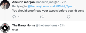 As the FAW were notified, TBH briefly faced being barred from Twitter following their offensive comments, and after the ban was lifted said that they were “beautiful”, yet queries have been raised about this contentious decision. The former leader of Plaid Cymru (PC) Leanne Wood spoke out against the restriction at the time, saying on Twitter: “…you ban the Barry Horns? For defending the NHS?”, this was then re-tweeted by the disgraced one-time PC (now independent) MP Jonathan Edwards.