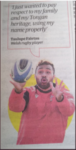 During an article about the importance of correct identity it was highlighted that the Welsh international rugby player Uilisi (Williis) Halaholo had said:  “I just wanted to pay respect to my family and my Tongan heritage, using my name properly”.