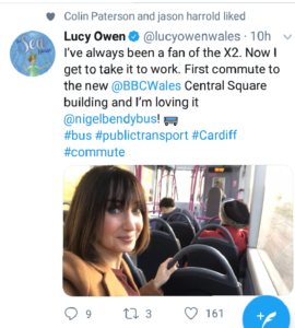 Controversial BBC Cymru Wales (BBC CW) presenter Lucy Owen has proclaimed the importance of travelling by bus to work in a tweet ‘liked’ by her lover the Editor of Radio Wales (RW) throwing the spotlight once again on the huge potential conflict of interest presented by their affair, The Eye can reveal.