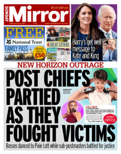More bad publicity for Ms Vennells followed this, with the front page splash in the Sunday Mirror screaming: “POST Office chiefs were filmed enjoying a lavish company bash as it fought wrongly jailed sub-postmasters in court.”.