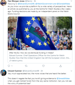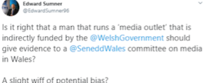 The commentator, Edward Sumner, asked provocatively about Ifan Morgan Jones, Editor of Nation.Cymru (NC): “Is it right that a man that runs a ‘media outlet’ that is indirectly funded by the @WelshGovernment should give evidence to a @SeneddWales committee on media in Wales? A slight whiff of potential bias?”