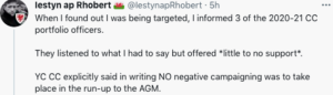 Another said YC ‘needs to sort it out’. It was disclosed by us that a letter had been sent to members warning of “Organisational and Accountability Failure”, that there has been “No financial oversight”, as well as a “Lack of transparency”.