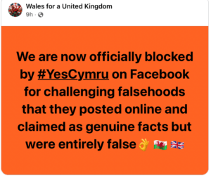 Wales for a United Kingdom (which is classed as a ‘community’ on the internet), have posted: “We are now officially blocked by (hashtag) YesCymru on Facebook for challenging falsehoods that they posted online and claimed as genuine facts but were entirely false (OK, Welsh and Union flags emojis).