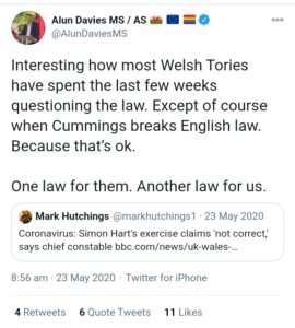 Disturbing revelations that three senior Welsh politicians and a party chief of staff may have breached coronavirus/Covid-19 rules, throw the spotlight on tweets of one of them when he condemned people voting against the regulations, saying they “don’t give a damn about the health and well-being of our people”.