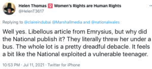 Just three days ago TN was accused on social media of ‘exploitation’. An aggrieved critic wrote: “Well yes. Libellous article from Emrysius, but why did the National publish it? They literally threw her under a bus. The whole lot is a pretty dreadful debacle. It feels a bit like the National exploited a vulnerable teenager”.