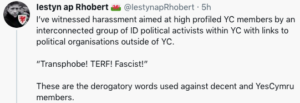 He added:  “‘I’ve witnessed harassment aimed at high profiled YC members by an interconnected group of ID political activists within YC with links to political organisations outside of YC. “‘Transphobe! TERF! (Trans-exclusionary Radical Feminist) Fascist! These are the derogatory words used against decent and YesCymru members’”.