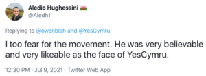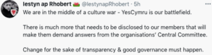 One wrote on Twitter“@yescymru are heading into dangerous waters, many of us belong to political parties who have stood with @yescymru on the same platform for independence, and would not desire to be tarnished by association”.