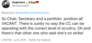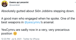The sudden announcement that Sion Jobbins is quitting as Chair of YesCymru (YC) has been met with total amazement by some in the Welsh nationalist community, while in other quarters there appears to be jubilation. There are worries now about the oversight in the group, with another backer of YC stating online: “So Chair, Secretary and a portfolio  position all VACANT. There is surely no way the CC (Central Committee – the governing body of YC) can be operating with the correct level of scrutiny. Oh and there’s that other one who said she’s on strike”.
