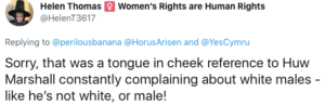 In a tweeted reply to YC, she said:  “Sorry, that was a tongue in cheek reference to Huw Marshall constantly complaining about white males – like he’s not white, or male!