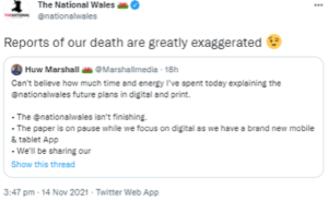 Perhaps living in a world of fantasy, this was in response to Mr Marshall saying, also on Twitter that “The @nationalwales isn’t finishing.