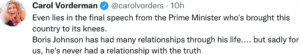 In the past Ms Vorderman has also tweeted about Mr Johnson that he: “Even lies in his final speech as Prime Minister who has brought this country to its knees. Boris Johnson has had many relationships through his life…. but sadly for us, he’s never had a relationship with the truth”.