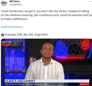 On GB News’ ‘ALBIE’S ARGUMENT’ it was stated: “‘Carol Vorderman, we get it, you don’t like the Tories. Instead of sitting on the sidelines moaning, join a political party, stand for election and try to make a difference.'”.