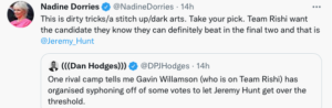 During the campaign, the UK Culture Secretary Nadine Dorries (who was herself considering a leadership bid at one point, but now backs another contender Liz Truss), wrote on Twitter about a supposed ‘rival camp’ message: “This is dirty trick/s stitch up/dark arts. Take your pick. Team Rishi want the candidate they can definitely beat in the final two and that is @Jeremy_Hunt”.