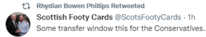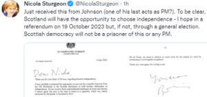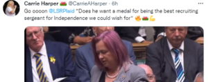 After the resignations of two UK Government Cabinet ministers (Rishi Sunak and Sajid Javid) (the first of a string of ministers to resign), he ratified remarks that the Tories were “pricks”, a further proclamation that there was “Nothing more treacherous than a Tory party in total disarray, wonderful stuff (smiley face)“, and another declaring “I’d like to leave the ‘United’ Kingdom please, @PrifWeinidog (Welsh for First Minister)“.