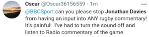 A fan declared: “I fucking hate Jonathan Davies”. Mr Davies’ commentary style has been compared unfavourably with that of another rugby international (England’s Brian Moore), when a viewer described Mr Moore’s departure from the airwaves as an “Appalling decision by the BBC”.