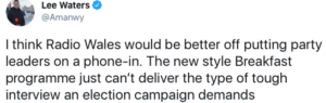 Lee Waters MS, the Deputy Economy Minister in Wales wrote on Twitter about last week’s election: “I think Radio Wales would be better off putting party leaders on a phone-in. The new style Breakfast programme just can’t deliver the type of tough interview an election campaign demands”.